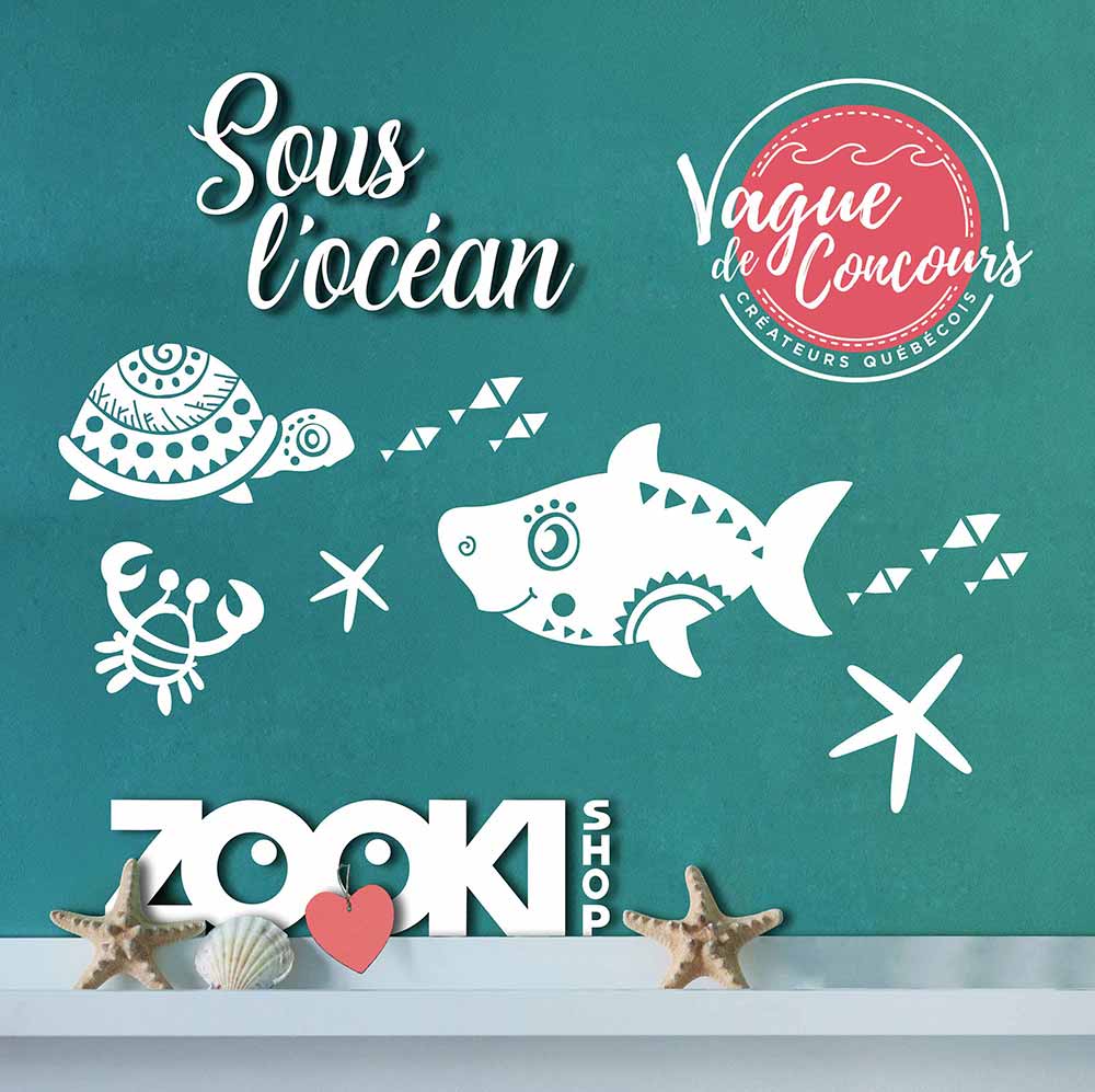 Vinyle autocollant mural “Sous l’océan” : tortue, poisson, étoile de mer, écrevisse. Projet présenté à “La vague des créateurs québécois”.